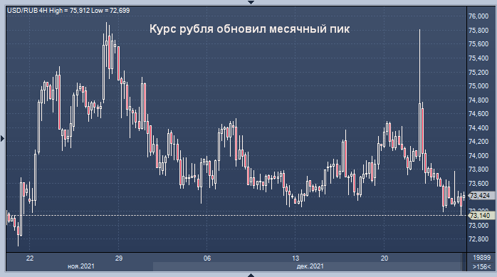 Российский рубль укрепился до более чем месячного максимума в условиях легкой торговли в пятницу, но акции снизились под давлением низкого аппетита к рискам и сохраняющихся опасений по поводу геополитического противостояния между Москвой и Западом. В 07:26 по Гринвичу рубль укрепился на 0,1% по отношению к доллару до 73,22 после достижения 73,15, уровня, который в последний раз наблюдался 19 ноября. По отношению к евро рубль прибавил 0,1% до 82,95.