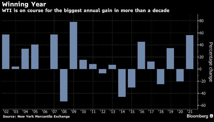 Нефть находится на пути к самому большому годовому приросту более чем за десятилетний период благодаря восстановлению спроса после наихудшей из всех пандемии. Она также может седьмой седьмой квартальный рост на этой неделе, что будет самой продолжительной прибыльной серией для WTI по крайней мере с 1983 года. Однако за последние пару месяцев рост замедлился из-за продажи резервов странами под эгидой США, омикрона и признаков смягчения спроса на азиатском рынке.