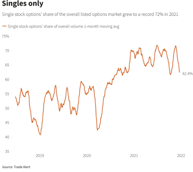 По данным JPMorgan, на них также приходится до половины торгов опционами на отдельные акции - ставок на отдельные акции. Это, в свою очередь, привело к тому, что доля таких опционов в общем объеме опционов в этом году достигла рекордного уровня, как показывает анализ данных Trade Alert агентством Reuters.