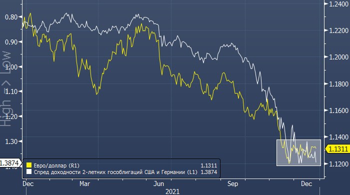 График курса евро к доллару интервалами 1 день (желтым, правая ценовая шкала) и спреда доходности между 2-летними гособлигациями США и Германии (белым, левая шкала)