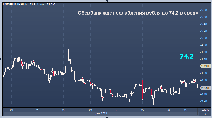 Рубль находится под усиленным геополитическим давлением с октября, поскольку западные страны выразили озабоченность по поводу наращивания военной мощи России вблизи соседней Украины. Москва заявила, что может перемещать свою армию по своей территории так, как сочтет необходимым. Торговая активность снизилась и, как ожидается, останется ниже среднего уровня до 10 января, окончания новогодних праздников в России. Московская биржа будет закрыта 31 декабря и возобновит торги на рынке форекс 3 января.
