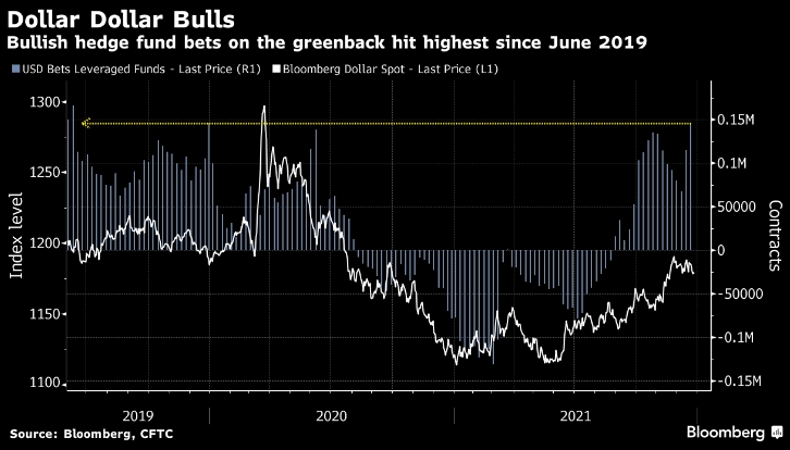 Согласно опросу Bank of America Corp., индекс Bloomberg Dollar Spot, выросший примерно на 5% в этом году, демонстрирует лучший годовой прирост за шесть лет, в то время как позиционирование фондов стало самым оптимистичным с 2015 года. Чистые длинные позиции хедж-фондов в валюте США выросли до самого высокого уровня с июня 2019 года, поскольку усилились ожидания ужесточения денежно-кредитной политики ФРС.