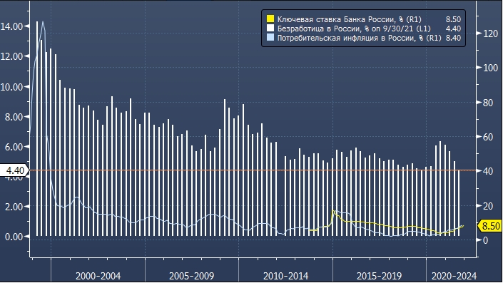 На графике отображена динамика инфляции, безработицы и ключевой ставки Банка России