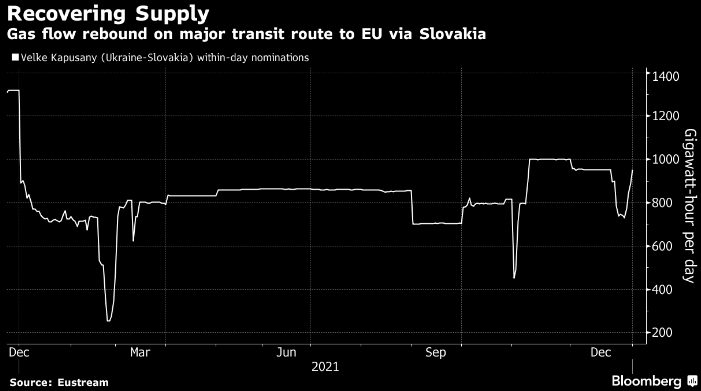 Данные словацкого трубопроводного оператора Eustream показали, что заявленные мощности для поставок российского газа из Украины в Словакию в пятницу через пограничный пункт Велке Капушаны, еще один крупный маршрут для российского газа в Европу, выросли до 953 087 мегаватт-часов (МВтч) с 891 692 в четверг, что стало четвертым днем роста подряд и достигло уровня, наблюдавшегося в период с 1 по 20 декабря.