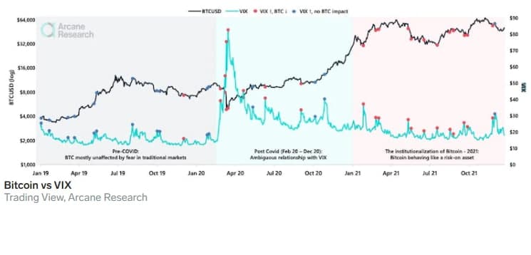 Скачки индекса волатильности на Cboe, или VIX, сопровождали распродажи биткоинов. Arcane Research предупредила, что встречный ветер на рынке в 2022 году может иметь последствия для краткосрочной ценовой траектории биткомна.