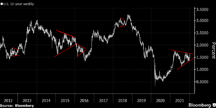 Доходность 10-летних гособлигаций США консолидируется в сужающемся треугольнике, и технические аналитики Bloomberg отмечают, что в последние 10 лет рынок всегда выходил из таких фигур в направлении господствовавшего тренда. Сегодня тренд направлен вверх, что создает предпосылки для дальнейшего роста доходности 10-летних трежерис в область 2%. Интересно, что средний прогноз опрошенных Bloomberg аналитиков по этому индикатору на конец четвертого квартала составляет 2.04%.