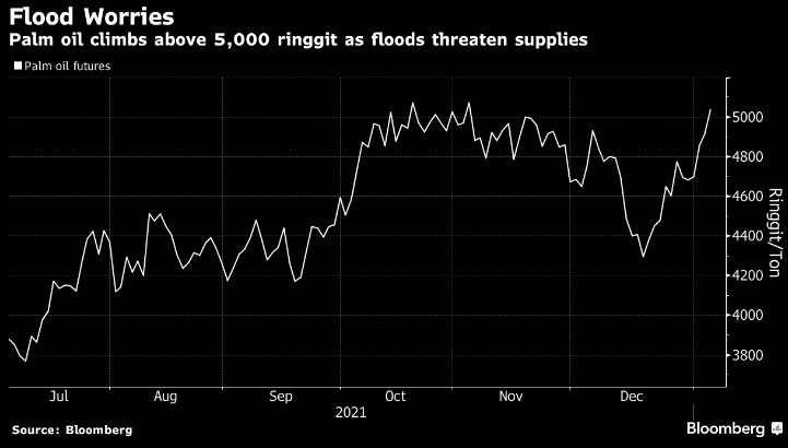 Биржевая цена пальмового масла выросла до двухмесячного максимума и закрылась выше 5000 ринггит (1192 доллара США) за тонну, поскольку проливные дожди и наводнения угрожают поставкам второго по величине производителя в Малайзии. Ведущие фьючерсы выросли четвертый день и закончили торги на отметке 5037 ринггит за тонну, что является максимальным показателем с 3 ноября. Запасы в Малайзии, вероятно, сократились до пятимесячного минимума в 1,70 миллиона тонн в конце декабря из-за наводнений и нехватки рабочих рук, самой острой с марта, по мнению аналитиков Bloomberg.
