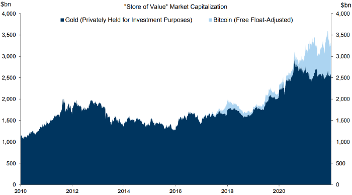 По оценкам GS, рыночная капитализация биткоина с поправкой на находящийся в свободном обращении объем этой криптовалюты составляет меньше $700 млрд, т. е. лишь около 20% от совокупной капитализации рынка «средств сохранения капитала», который, по мнению банка, состоит из золота и биткоина. Объем инвестиционного золота, доступного для покупки, Goldman оценивает в $2,6 трлн.