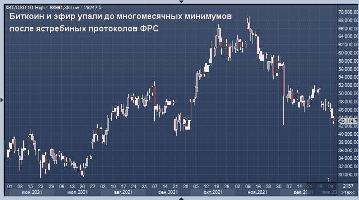Биткоин упал ниже 43000 долларов в четверг, протестировав многомесячные минимумы после выхода минуток последнего заседания Федеральной резервной системы, которые показали, что она склоняется к более агрессивным политическим действиям, что подорвало аппетит инвесторов к более рискованным активам.