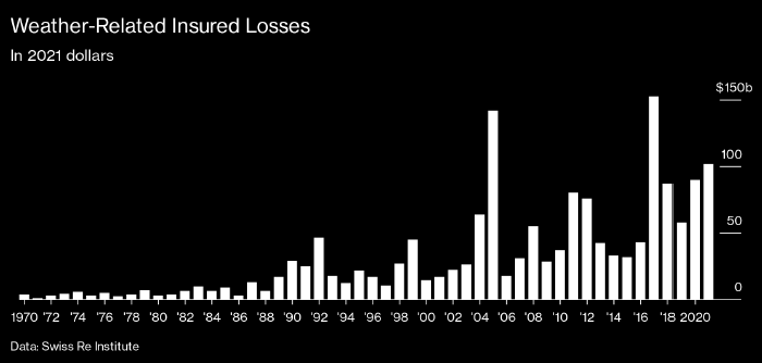 Объем страховых выплат, связанных с погодными катаклизмами, в млрд долларов в год. Данные: Swiss Re Institute, источник: Bloomberg