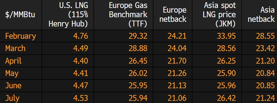 В таблице ниже показана потенциальная прибыльность экспорта сжиженного природного газа из США в Европу и Азию с использованием предположений BloombergNEF и Bloomberg: сырьевые товары по справедливой стоимости цены на момент публикации.