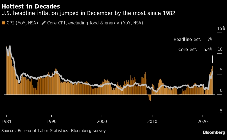 Инфляция росла самыми быстрыми 12-месячными темпами почти за 40 лет в декабре, согласно тщательно отслеживаемому показателю Министерства труда, опубликованному в среду. По данным Бюро статистики труда министерства, индекс потребительских цен, измеряющий затраты на десятки товаров, вырос на 7%. В месячном исчислении индекс потребительских цен увеличился на 0,5%.