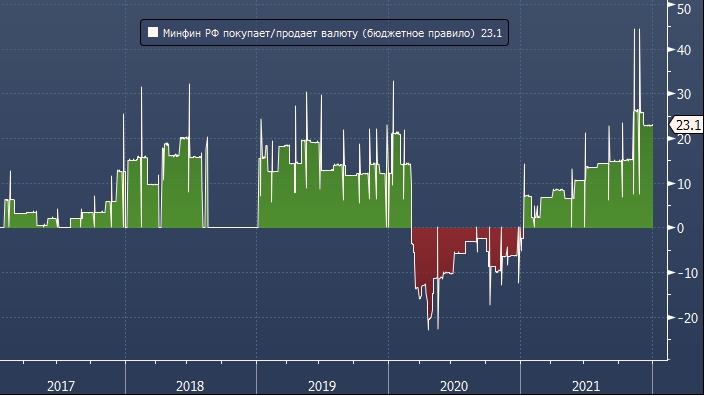 12 января Министерство финансов России объявило, что ежемесячные покупки иностранной валюты (FX) и золота увеличатся с 502 млрд руб. в декабре 2021 г. до 586 млрд руб. в январе 2022 г., что соответствует увеличению с 6,8 млрд до 7,9 млрд долларов, по курсу на Forex в среду.