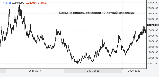 Цена никеля взлетела до 10-летнего максимума в $21 800 за тонну