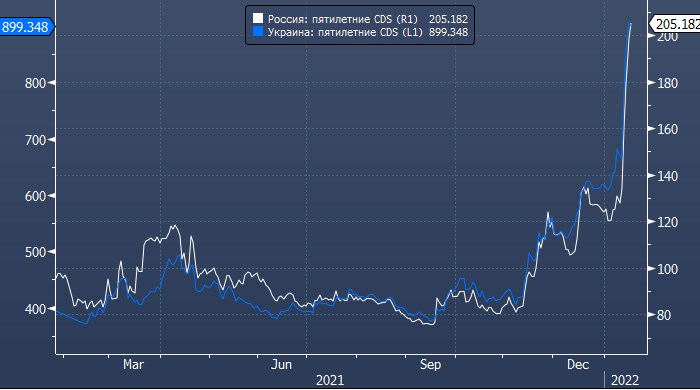 Стоимость пятилетнего кредитного дефолтного свопа (CDS), страхующего от дефолта России (CDS)*, сегодня достигала нового рекордного значения с марта 2020 года на уровне 224 б.п. Стоимость аналогичного инструмента, страхующего от дефолта Украины, поднималась до нового рекорда с весны 2015 года на уровне 919 б.п.
