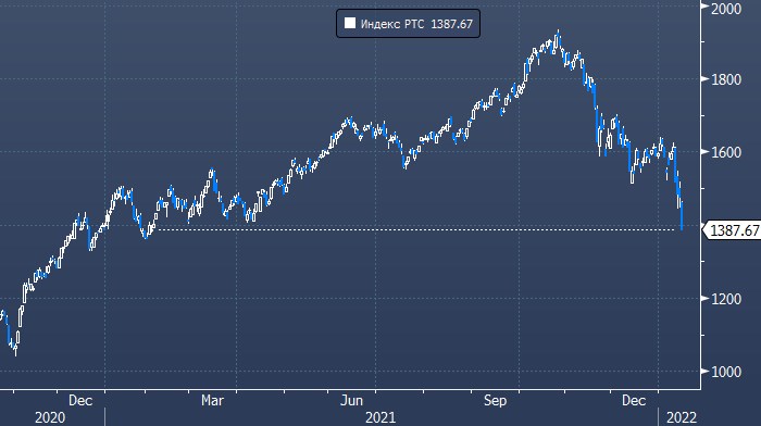Рынок акций РФ продолжает свободное падение: индекс РТС сегодня впервые с февраля 2021 года опустился ниже 1400 пунктов, а его форвардный коэффициент «цена/прибыль» (Forward P/E) составляет 4,7х против 5,23х на дне марта 2020 года.