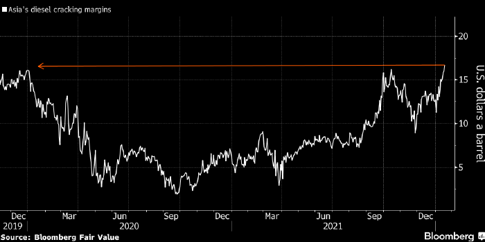 Маржинальность производства дизеля в Азии в долларах за баррель. Источник: Bloomberg