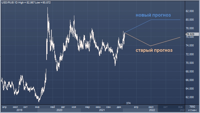 Если ранее банк ожидал 74 рубля за доллар к середине года и 76 — к концу 2022 г., то теперь он прогнозирует 80 рублей за доллар через 6 месяцев и 80 — в конце декабря.