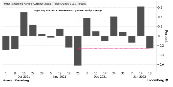 Тем не менее, в среду индекс падал третий день, причем снижение возглавили малайзийский ринггит и индонезийская рупия. В то же время индекс доллара Bloomberg продемонстрировал максимальный прирост во вторник с первого торгового дня года.