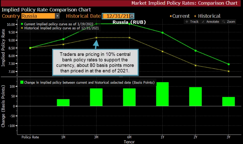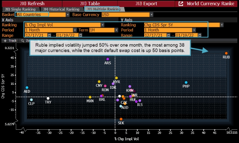 Месячная подразумеваемая волатильность рубля подскочила почти на 50% в прошлом месяце, хаметнее всего среди 38 основных валют, в то время как кредитно-дефолтные свопы на российские облигации за этот период выросли почти на 50 базисных пунктов. Трейдеры ожидают повышение ключевой ставки центрального банка до 10%, чтобы поддержать рубль, который ослаб на негативных новостях по Украине. Президент США Джо Байден заявил, что, по его мнению, Россия "въедет" на Украине.