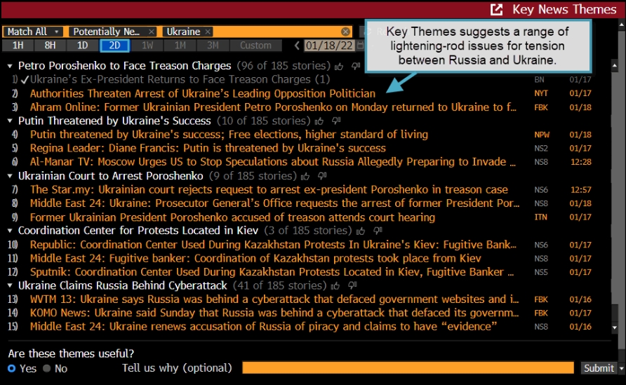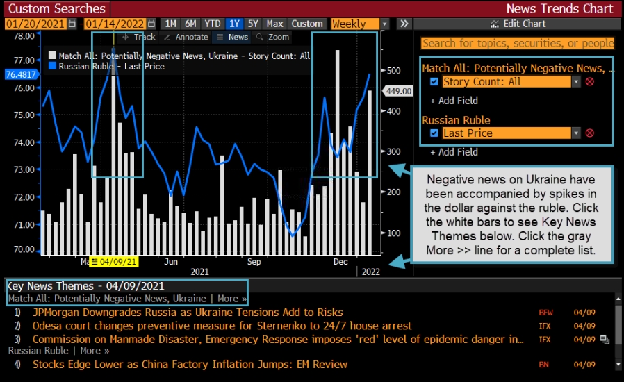 Доллар вырос по отношению к рублю с конца ноября на фоне всплеска потенциально негативных новостей об Украине из более чем 150 000 источников новостей и социальных сетей. Доллар/рубль также вырос в апреле, когда JPMorgan понизил рейтинг России на фоне напряженности в Украине.