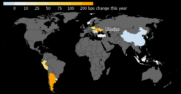 На приведенной выше карте отмечены страны, центробанки которых повысили ставки в этом году. Цветовая палитра обозначает размер таких повышения. Источник: Bloomberg
