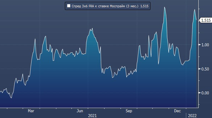 Участники рынка производных инструментов ждут повышения ставок и в России. Спред 3×6 FRA* к индикативной ставке MosPrime составляет в настоящий момент чуть больше 1,50%, тогда как во вторник, 18 января, он достигал примерно 1,75%.