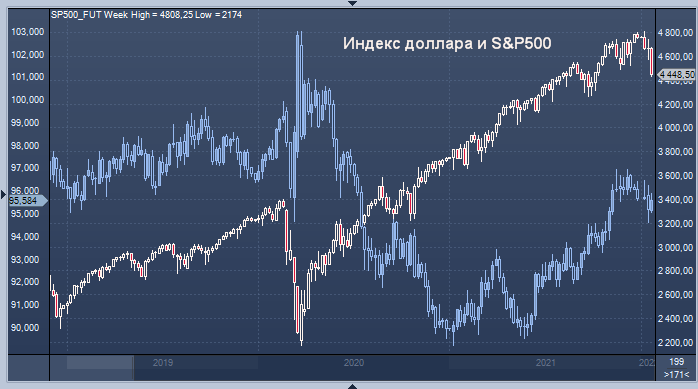 График индекса доллара и фьючерса на индекс S&P 500 интервалами в 1 неделю