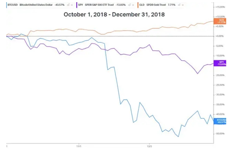 Первый показывает, что, когда акции упали почти на 20% в четвертом квартале 2018 года, биткоин упал на 50%, а золото выросло почти на 8%. Волатильность рынка была вызвана ястребиным поведением Федеральной резервной системы и опасениями замедления экономического роста из-за торговых тарифов.
