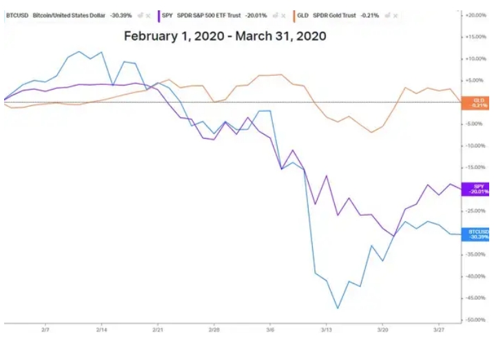 Второй перенесет нас к началу пандемии COVID-19 в начале 2020 года, когда биткоин снова упал почти на 50%, а акции упали на целых 34%. В условиях резни, связанной с отказом от риска, золото торговалось без изменений, еще раз доказав свою репутацию актива-убежища.