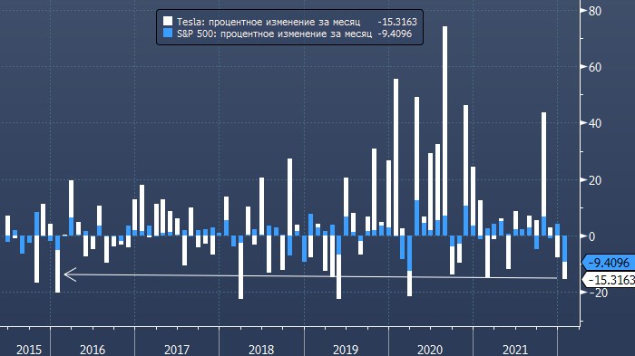 Процентное изменение за месяц акций Tesla (белым) и индекса S&P 500 (синим)