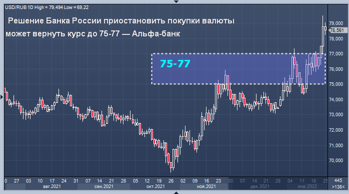 "ЦБ РФ в понедельник объявил о решении остановить покупки иностранной валюты на локальном рынке, проводимые в рамках бюджетного правила. До 4 февраля 2022г суточный объем этих операций был установлен на уровне 36,6 млрд руб., или $460 млн; в результате этого шага локальный рынок получит косвенную поддержку в размере примерно $1,9 млрд на оставшуюся часть недели и $2,3 млрд в течение будущей недели", - отмечает г-жа Орлова.