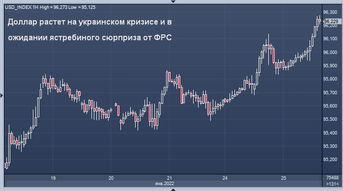 Доллар вырос до двухнедельного пика во вторник, так как напряженность между Россией и Западом из-за Украины привлекла инвесторов к валютам-убежищам в ожидании результатов заседания Федеральной резервной системы США по монетарной политике на этой неделе.