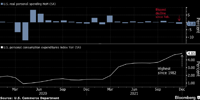 Процентное месячное изменение реальных потребительских расходов в США (серая гистограмма, верхний график) и Ценовой индекс расходов на личное потребление (PCE Index. Именно за этим индикатором, который достиг рекордного уровня с 1982 года, ФРС следит особенно внимательно). Источник: Bloomberg