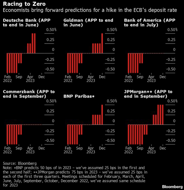 Такой график означал бы даже более раннее прекращение покупки облигаций, чем планируется в настоящее время, учитывая заявленное намерение ЕЦБ сначала прекратить эту меру стимулирования. Аналитики Goldman и Deutsche Bank ожидают, что скупка долговых обязательств прекратится в июне. Commerzbank, у которого такой же прогноз ставок на 2022 год, видит прекращение покупок в начале сентября.