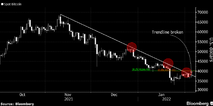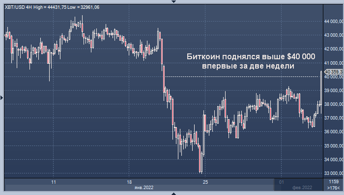 Эта неделя выдалась для финансовых рынок весьма волатильной, однако сегодня биткоин уверенно пробил падающую линию сопротивления, проведенную по максимумам ноября и декабря, и впервые за две недели поднялся выше $40 000.