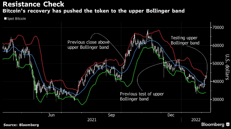 30-процентное ралли биткоина с минимумов в конце января привело к тому, что токен тестирует верхнюю границу своей 20-дневной полосы Боллинджера, технический паттерн, который может сигнализировать о сопротивлении.