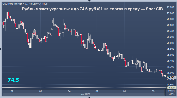 Рубль может укрепиться по отношению к доллару до уровня 74,5 руб./$1 на торговой сессии в среду благодаря ослаблению геополитической напряженности, считают аналитики Sber CIB.