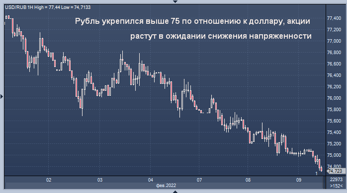 Рубль в среду, скорее всего, будет торговаться в диапазоне 74,6-76 руб./$1 и на уровне 85,74-87 руб./EUR1, говорится в комментарии "Альфа-Капитала". Рубль опирается на последовательное сокращение геополитических рисков. На открытии торгов в среду, 9 февраля, российский рубль дорожает в парах с мировыми валютами.
