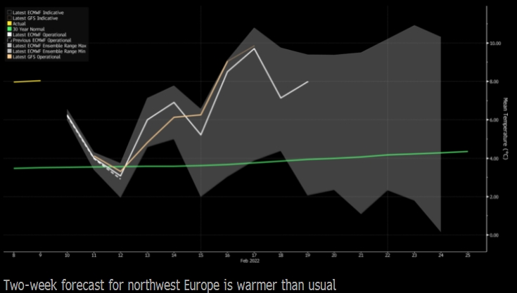 В то время как в Европе ожидается более мягкая, чем обычно, погода, за исключением Скандинавии, Maxar Technologies Inc. заявила, что будет немного прохладнее, чем прогнозировалось ранее. В результате спрос на газ может быть не таким низким, как ожидалось, в последние несколько недель зимнего отопительного сезона.