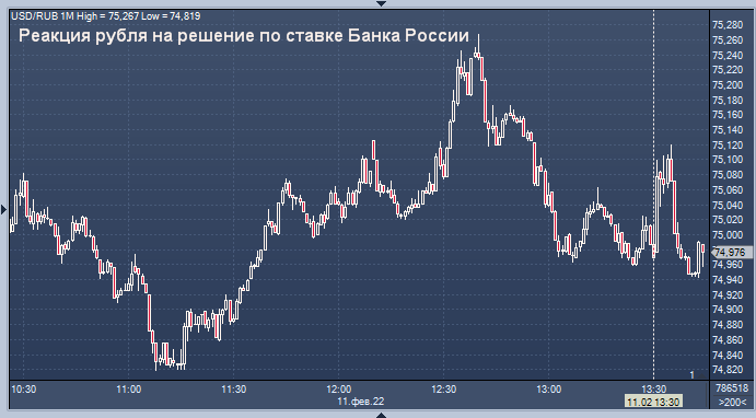 После данных о высокой инфляции в эту среду даже последний голубь превратился в ястреба, поэтому все подтянули прогнозы, и сегодня уже подъем ставки Банка России на процент до 9,50% уже никого не удивил. Рубль потерял около 10 копеек после этого решения и заявления о том, что повышение ставки в дальнейшем возможно на следующих заседаниях регулятора, но сейчас уже все вернул. Так что в сухом остатке можно сказать, что как таковой реакции на решение нет, и даже нет ее на жесткие комментарии регулятора. Все это осталось за скобками сегодняшних движений, большая часть из которых является реакцией на вчерашние сильные инфляционные данные в США, усилившие ожидания подъема ставки ФРС в марте на 50 пунктов, и геополитику.