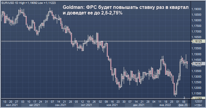 Goldman Sachs теперь ожидает 7 повышений процентной ставки от ФРС в этом году на 25 базисных пунктов по сравнению с предыдущим прогнозом в пять. При этом денежный рынок по-прежнему подразумевает повышение ставки ЕЦБ на 10 б.п к июню и на 50 б.п. к концу года.