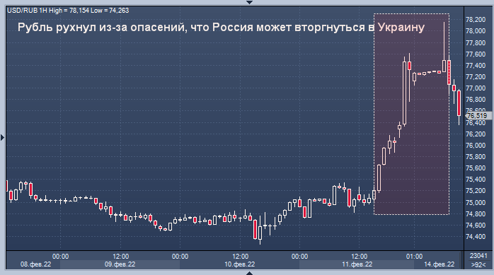 Рубль резко упал в начале понедельника, сведя на нет успехи, достигнутые более чем за две недели, поскольку игроки избавились от российских активов из-за возобновившихся опасений, что Россия готовится вторгнуться в Украину в ближайшем будущем, сценарий, который Москва отвергает как западную пропаганду войны в нарушение международной конвенции, запрещающей это.