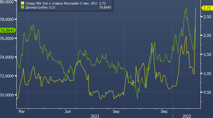 Динамика спреда 3×6 FRA к индикативной 3-месячной ставке MosPrime (желтым, правая ценовая шкала) и курса доллара к рублю (зеленым, левая шкала) интервалами 1 день