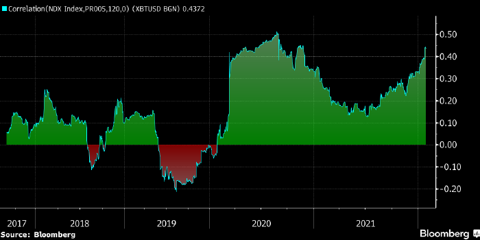Биткоин все лучше коррелирует с мировым рынком акций, чем лишний раз доказывает правоту тех инвесторов, кто считает его чистым рискованным активом, а не защитой от ненастья, вроде золота. Наибольшую корреляцию биткоин демонстрирует в паре с Nasdaq 100, который исторически является главным бенефициаром низких ставок и выступает главным аутсайдером в периоды ужесточения денежно-кредитной политики.
