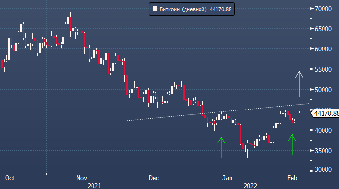 Отметим также, что на дневном графике биткоина формируется перевернутая техническая фигура «голова и плечи». В случае прорыва выше ее лини шеи в области $47 000 следующей целью станет область $55 000.