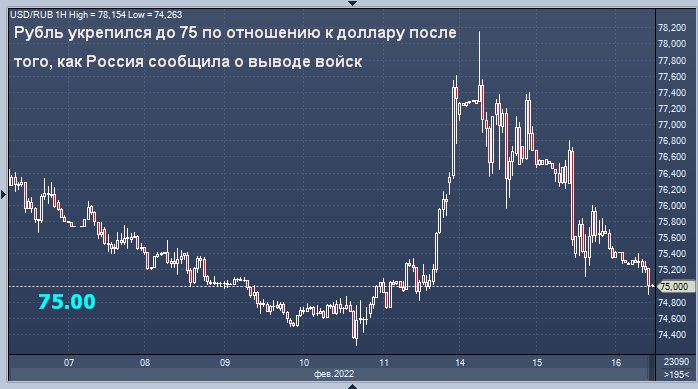 Рубль укрепился до 75 по отношению к доллару в среду, продолжая восстановление на фоне ослабления опасений по поводу неминуемого вторжения России в Украину после того, как Москва сообщила об отводе части сил от границы.