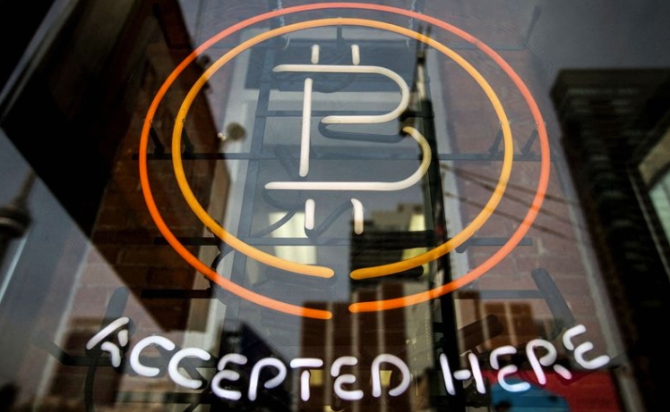 Знак биткойна в окне в Торонто, 8 мая 2014 года. REUTERS/Mark Blinch