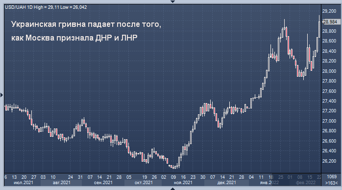 Украинская валюта гривна ослабла более чем на 1% с начала торговой сессии во вторник после того, как Россия официально признала независимость двух областей на востоке Украины, показали данные Refinitiv.