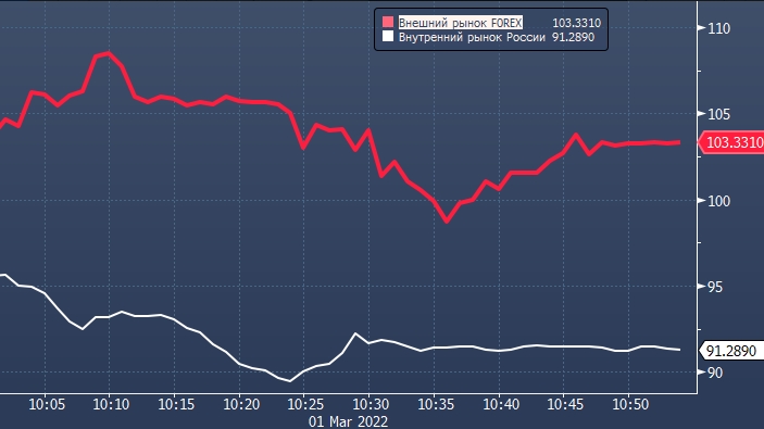 В результате возник громадный спрос на спотовом и форвардном рынке по инструменту доллар/рубль за пределами России — на международном валютном рынке Forex. Регулятор РФ употребляет слово "временная", когда выдал брокерам приказ приостановить исполнение поручений нерезидентов. Пока не ясно, будет ли такой запрет постоянным ответом на блокировку Западом золото-валютных резервов России или же иностранцам все же позволят вывести капиталы за границу после стабилизации ситуации с курсом рубля.